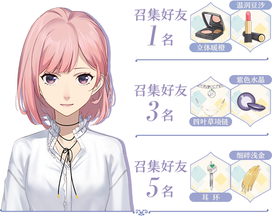 1 『召集好友』:完成公测预约并成功召集未预约好友在自己的专属预约链接中预约,预约好友达到一定人数即可获得对应档位奖励。『召集好友』奖励礼包将在全平台公测的7个工作日内通过短信发送至您的预约手机中。『召集好友』奖励礼包限官方用户(官方iOS及老虎安卓)使用,同角色同类礼包仅限兑换一次。